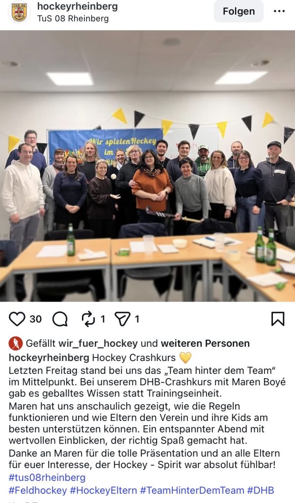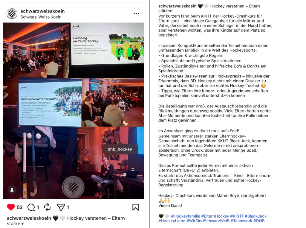 Der Hockey-Crashkurs konnte in den vergangenen Wochen in einigen Clubs bereits große Erfolge feiern. Die Teilnehmenden können sich auf informative Stunden mit neuem Wissen und spannenden Geschichten aus dem Hockeysport freuen, bei denen allen die Möglichkeit gegeben wird, sich auf einfache und unkomplizierte Art mit dem Basiswissen des Hockeys vertraut zu machen. Unsere Referent*innen gehen gezielt auf die Bedürfnisse der Runde ein. Ideal, um euren Eltern endlich eine Plattform für ihre Fragen zu bieten.