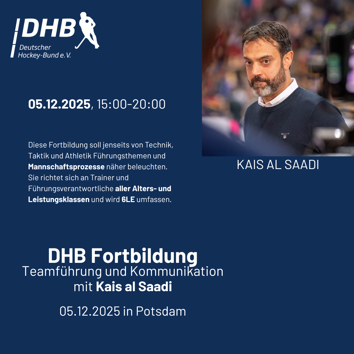 Kais al Saadi wird mit euch zur Führung von Mannschaftsprozessen und Kommunikation arbeiten. Sei dabei und nutze die Gelegenheit für wichtige 6LE für deine Lizenzverlängerung.